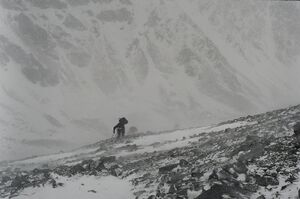 Вышли около 8 часов. Но из-за сильного ветра продвигались медленно. Под перевал подошли часа через 4. На взлете на перевал было особенно ветрено, того гляди собьет с ног. Поднявшись на перевал, было уже ясно, что дальше идти не стоит, потому что гребень довольно острый на спуске, а при таком ветре улететь с него пара пустяков. Поэтому было решено спуститься с седловины немного ниже, и в небольшой мульде заночевать. Поставили палатку, окопали ее, дежурные приготовили еду. Снова сломался примус, достали запасной и снова на двух примусах готовили.
