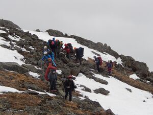 Решили отправляться немедленно: собираем палатки, тенты и идём. Всё так же метёт пурга, а мы поднимаемся по сыпухе (или как указано в отчёте: по пологому крупно-осыпному склону).