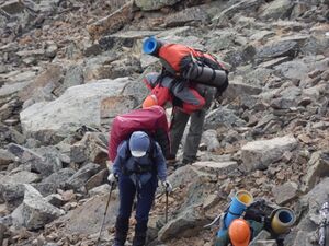 Они прошли около половины пути до седловины и выяснили рельеф местности, по которому нам предстояло подниматься: всё те же кулуары, курумы и сыпухи.