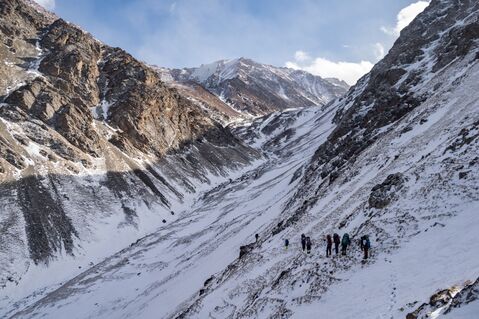 Достаточно быстро, за несколько ходок, преодолеваем высоту 3000 метров, и у многих участников группы, включая меня, это первые их три тысячи. Сева вспоминает, кому и на какой высоте впервые стало плохо от горной болезни на акклиматизации три года назад и гадает, получится ли так же с нашей группой. На трех с небольшим тысячах организм начинает ощущать, что что-то поменялось, начинает слегка мутить, появляется сильная одышка. Идти это никак не мешает, лишь стало совсем слегка тяжелее. Но некоторым ребятам оказывается похуже, и первым к нашему медику Юле за диакарбом обращается Илья, которого начинает подташнивать. После обеда и небольшого отдыха ему становится лучше, и дальше он идет так же, как и шел. Несладко приходится Егору, которому тоже становится нехорошо от высоты, и он тоже пьет диакарб.
