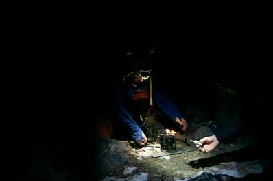 Александр Петрович ходит на разведку наверх, пока мы проверяем кошки и ставим лагерь. За горын сегодня ответственным становится Антон. Он пытается его наладить, и на какое-то время горын начинает работать лучше.