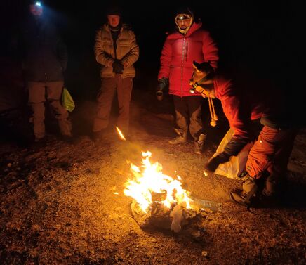 Добегаем до воды мы еще засветло, сбросив около километра высоты – находим ее, текущую под тонким льдом между камней. Обрадовавшись долгожданной жидкой воде, останавливаемся и пьем. Руковод в это время убегает чуть вперед. Вскоре он возвращается назад, к нам, и провозглашает: «Идемте, там такая классная полянка с говном!» Дело в том, что до воды-то мы добежали, но до дров добежать бы никак за сегодня не успели, при этом, еду готовить на чем-то нам надо было. Никаких других вариантов, кроме использования биотоплива, нам не оставалось…