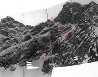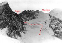 Со стороны Арчалытора практически из-под перевала. Мы спускались, где показано, все время по кулуару. Зимой все вмерзшее, камнеопасность незначительная. Летом по кулуару идти нельзя. Надо правее кулуара (как смотришь) по контрфорсу. Нечаев так и поднимался. Низ крутой, верх положе, но без веревки нельзя нигде. В нижней части кулуара видна сосулька - это и есть сброс 60 м, про кот. я упоминал.
