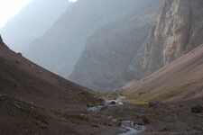 Долина реки Правый Зиндон сразу напоминает восточные сказки про джинов из "Тысячи и одной ночи" - просто готовые декорации. Тропа Хо Ши Мина везде маркирована турами. До озера Большое Алло есть два больших завала - огромные глыбы размером от чемодана до грузовика, без туров там потеряться легко бы было, спасибо тем, кто их сваял. Спуск к озеру мне показался самой романтичной частью маршрута, вечерело, погода стояла тёплая, ветра нет, солнце медленно клонилось к Западу. В голове крутились стихи: "Погоди немного - отдохнёшь и ты..." Как-будто медленно гаснет свет в театре "Старый Дом". Вот уже стало совсем темно - и внизу слабо засияло озеро. Ну, тут мы уже спустились, конечно, почти до берега. Устали, естественно, сильно. От воды к палатке после такого перехода трудно было подняться с котелком воды.