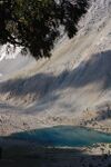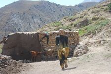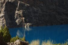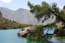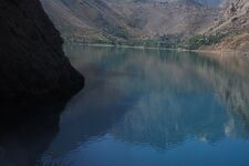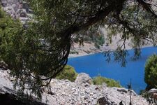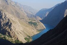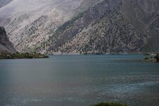 Утром нас напоили чаем и мы пошли вниз к озеру, в цивилизацию. Спустились довольно быстро и без проблем. Тропы тут везде есть. Один дехканин попросил "гвозди, которые в скалу забивают - мумиё буду собирать". "Гвозди, которые в скалу забивают" были общественные, поэтому мы их зажали. В первом же доме, куда мы обратились насчёт машины, нам сказали подождать, через некоторое время вышел аксакал, поговорили кто, откуда, куда. Угостили абрикосами. Внешность местных жителей, как нам и говорили по ту сторону перевала, отличается, тут живёт другой род. Женщины постоянно прячут лица под чадрой. Старик повёл нас к своему родственнику у которого есть УАЗик, и мы довольно быстро договорились. Дальше - дорога вдоль цепочки живописных озёр. Вода во всех озёрах отличается по цвету, но везде прозрачная. Видно как снуют косяки рыб. Посёлки, сады, чем ниже - тем жарче и суше. Где-то после посёлка Фильмандар есть пост ГАИ, у нас оказался один паспорт на двоих - этого было достаточно. Внешне ситуация на посту выглядела так: тормознув машину, гаишник запросил паспорта (у меня был с собой внутренний паспорт), переписал данные в общую тетрадь. "А там в машине кто? Жена?" - спрашивает - "Да". "А, понятно, давай, счастливо".