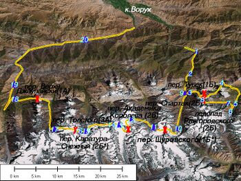 пер. Дунон н/к 2490 - р. Кшемыш - пер. Тубек 1Б 4200 - озеро Каракуль-катта - пер. Спартак 2Б 4500 - р. Кшемыш - ледник Кшемыш - пер. Щуровского 1Б* 4400 - ледник Щуровского - пер. Академика Королева 2Б* 4950 - ледник Толстого - пер. Толстого 3А 4900 - пер. Каратура-Снежный 3A-2Б* 5150 - вершина Узловая - ледник Тамынген - р. Тамынген - перевал Верхне-Джаупайский 1A 3600 - р. Аксу - р. Каравшин - кишлак Ворух.