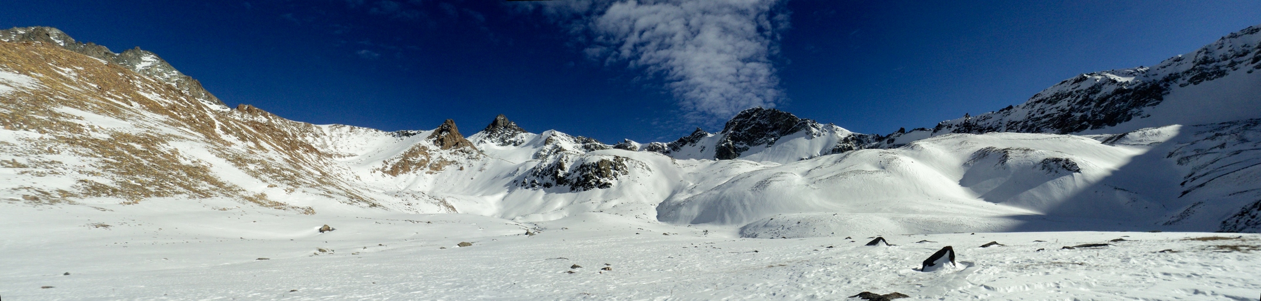 Общий вид ледника Туюк мало отличается от летних фотографий. Неожиданно мощно доминирует стена пика Медик. Изорван путь в западную камеру, к перевалу Медик 2А, а сам перевал существенно сильнее заснежен. На юге красивый перевал Туюксу Западный. Однако наиболее интересный объект появляется из-за поворота в северо-восточной части ледника. Там есть верхняя камера, составляющая плато перевала Жаркий 3А и отделившаяся от основного тела ледника. Теперь она наползает широким висячим ледником на бараньи лбы. Под ними, на безопасном удалении в центре цирка, на отметке 3994, мы и ставим лагерь. Группа устала, перевальный взлёт под снегом и давно освещён, поэтому прохождение перевала Алтынтор-ашу откладываем на утро.
