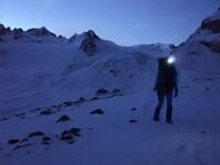 Последний идёт на три такта с нижней страховкой. От нижней станции на крючьях проходим ещё одну нарощенную(для экономии времени не стали развязывать) верёвку вдоль скал. У нижнего её конца уже вполне можно идти вниз на три такта без дополнительной страховки. Склон уже давно освещён и вокруг много небольших лавинных выносов, так что мы торопимся и ещё яснее осознаём полезность нашего раннего выхода.