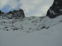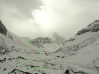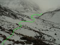 Медленно, по перилам (две коротких верёвки) проходим под жандармами на настоящую седловину. Тура не видно. Погода по-прежнему плохая. Спускаемся по слабозаснеженной осыпи косым траверсом влево, затем по снегу прямо вниз на ровный ледник.