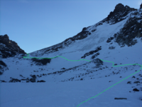 Предпочтительнее выглядит путь по покатому гребню севернее отметки 3731 на топокарте, или даже по ложбине ещё севернее, выводящей на седловину в этом гребне,
