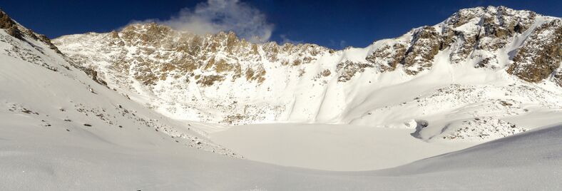 Через ходку забираем влево, стараясь подниматься на морены по наименее заснеженным склонам южной экспозиции. На панораме видно, что наиболее очевидный путь на перевал - слева от пары вершинок. Однако, не имея информации о характере противоположного склона, мы выбрали путь по моренам на ледник, так, как, если бы заходили на Кичитор с Сокулука. На моренах приходится часто снимать и одевать снегоступы. Донимает порывистый ветер. На 3650 находим понижение, относительно защищённое от ветра, и там ночуем,