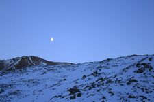 За ходку дошли до озера. По замершему льду прошли до прохода в цирк перевала Таджилу. Расположение озера в низине, в скальном цирке, позволяло быть уверенным в толщине льда. Прошли по озеру, рис.24. Подъем от озера до выхода в цирк перевала был крутой, проходил по твердому слою снега, приходилось рубить в снегу ступени, сначала в снегоступах, потом без них рис.25. Дальнейший путь к перевалу проходил по курумнику, покрытому слоем свежего снега. Примерно 12:30 подошли к перевалу. Один из участников сообщил, что ему нехорошо, может разболеться на следующий день и что перевал желательно пройти сегодня. На предыдущей ходке был плотный перекус, потому было решено пообедать на перевале. Перевал был засыпан снегом и были опасения насчет лавинной опасности на подъеме, описанном отчетах Маркова и Лучко, рис.26. Было решено идти вдоль скал слева, это сильно увеличило бы высоту подъема, так как пришлось бы подняться на высоту вершины 3284, но сделало бы путь безопаснее рис.27. Шли в связках. После 70 метров подъема толщина снега сильно уменьшилась и стал очевидным выход на перевал без захода на вершину. На перевал вышли около 15 часов, сняли записку т/к/ Экватор, рис.28. Продолжили движение вдоль левого склона, где отмечена тропа на карте. Подошли под резкий скально-осыпной склон, идущий вниз, разведка склона с бокового жандарма показала, что склон доходит до низу без скальных сбросов, рис.29. К этому моменту было около 16 часов и завершить спуск в светлое время суток не представлялось возможным, к тому же группа была утомлена. Было решено заночевать на перевале, не смотря на плохое самочувствие одного из участников, и заодно совершить радиальный выход на вершину на следующий день, при условии приемлемого состояния группы. На перевале работает сотовая связь beeline, а также открываются виды на Северо-Чуйский, Катунский хребты, видна Белуха, рис.30.