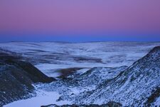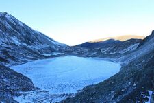 Решено было идти по озерам, чтобы обойти курумник и тем самым повысить скорость передвижения группы и понизить травмоопасность рис.17. Толщина льда на озерах была не менее 30-40 см. Предполагая наличие полыньи, шли соблюдая дистанцию, предварительно расположив имеющиеся веревки “в близком доступе”. По мере передвижения по озерам уменьшения толщины льда замечено не было. Был виден подъем на перевал “Полезный”, рис.18. Через 3 ходки вышли на склон долины реки прав.Кубадру, где встретили другую группу пришедшую из долины, в которую мы направлялись, рис.19, рис.20. Нам сообщили, что в той долине снега много и понадобятся снегоступы, а так же о том, что нам предстоит 5 бродов рек. Примерно описали места перехода рек. В этот день дошли до слияния рек прав. и лев. Кубадру, пройдя суммарно 3 брода,, рис.21( два раза через прав.Кубадру и через лев.Кубадру). На последних двух бродах использовалась подстраховка веревкой, переходили по ледовым мостам. Встали на ночлег примерно в 16 часов. На утро подъем был назначен на 5. Жгли костер, грелись, отдыхали. Во время пути в этот день был виден перевал Таджилу рис.22.