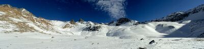 Через ходку забираем влево, стараясь подниматься на морены по наименее заснеженным склонам южной экспозиции. На панораме видно, что наиболее очевидный путь на перевал - слева от пары вершинок. Однако, не имея информации о характере противоположного склона, мы выбрали путь по моренам на ледник, так, как, если бы заходили на Кичитор с Сокулука. На моренах приходится часто снимать и одевать снегоступы. Донимает порывистый ветер. На 3650 находим понижение, относительно защищённое от ветра, и там ночуем, вырыв площадку и построив небольшую стенку.