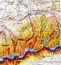 Планировалось ещё пройти перевалы в Караунгурском, Киенсайском, Суурлинском и Озёрном отрогах, перевал НГУ 2А, затем восхождение на пик Семёнова-Тян-Шанского и выход по р. Малый Баскан (на хребтовке запланированная нитка показана зелёной линией). Так как много времени потратили на предварительную разведку (перевалов, троп и т.п.), в итоге пришлось выходить по реке Кунакбай на Большой Баскан.