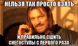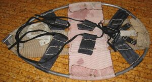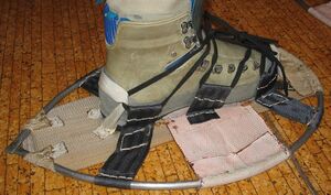Потом к снегоступу пришиваются петли для завязок. Сколько людей, столько вариантов, не суть важно, лишь бы снегоступ не слетал с ноги. Я делаю обвязку, как на привязных кошках, другие могут по-своему. Короче, придумываешь, как привязывать, делаешь, потом обуваешь снегоступы и идешь в них в лес (еще лучше в какой-нибудь заснеженный овраг, чтоб пересеченка была). Гуляешь пару-тройку километров. За это время снегоступы с ноги много раз спадывают, ты с матами возвращаешься домой и, приговаривая что-нибудь вроде "Что ж это такое, я шил старался, а вы, сволочи, е мое..." и тому подобное, переделываешь завязки. Потом снова идешь в овраг, и так до тех пор, пока сможешь пару км пройти, чтоб ни разу не спали. Важно обратить внимание: чтобы ни носок ботинка не проскакивал сквозь завязки, ни пятка. На картинках образец моей завязки есть.