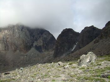 На следующий день (13 июля) мы встали в 5.00, погода была замечательная, и даже проглядывался наш путь на гребень. Фотография с места ночёвки. Путь наш шёл на гребень через седловину.