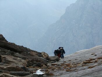 В 12.10 мы выдвинулись дальше. От озера ещё метров 700-800 тропа шла по морене, а затем выводила на ледник. Трещины начинаются практически сразу, поэтому следует идти в связках. Пройдя немного по леднику, подошли к месту, где справа открылись большие трещины, «закругляющиеся» резко вниз к левому склону. Поэтому в этом месте ледника следует выходить на середину – там его проще распутывать. Нам повезло – в этом месте ледник был открытый. Однако после преодоления одной ступени ледника, мы вышли к месту, где было довольно много снега, пришлось надеть фонарики.