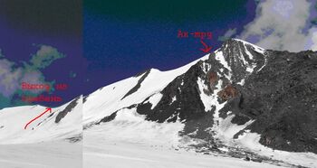В 7.50, оставив вещи в палатках, мы пошли покорять Ак-тру. В 8.20 мы уже начали подниматься на гребень. Крутизна этого подъёма около 25-30 градусов. Затем, поднявшись на гребень, нужно идти по гребню на восток. Опасность заключается лишь в том, что на север свисают опасные карнизы, поэтому по гребню стоит идти максимально близко к южному склону. Ещё перед вершиной будет небольшой спуск, а затем подъём. Последние 50 метров до вершины нужно пролезть по камням. На вершине мы были уже в 10.00. GPS показал высоту 4050метров. Сняли записку туристско-альпинистского клуба томского университета систем управления «Такт» от 20 июня 2008 года. Полюбовавшись и нафотографировавшись вдоволь, мы начали спуск.
