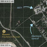 Геодезическая вышка находится в сосновом бору у пересечения Бердского шоссе с железной дорогой.