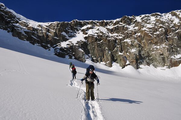Собственно откуда мы спустились - чуть правее седловины (если приглядеться - видны следы посередине спуска на снежнике)