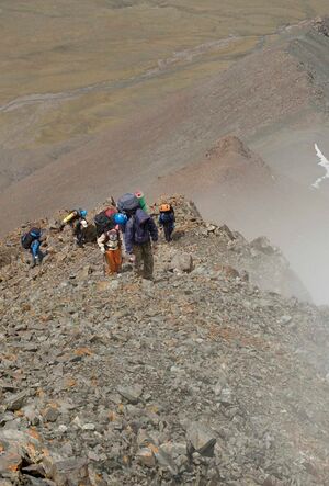 Сутра мы дошли до прямоугольного озерца и от него свернули налево в долину, достаточно крутую. Поднимались туда долго и упорно. По пути Жене Мальковичу чуть не отдавило ногу здоровым валуном, полтора на пол метра. Валун оказался живой, кто-то на него наступил, а Женя был рядом, вообщем ногу ему придавило, но без особых последствий - отделался синяком. Шли мы так значит шли, пока не дошли до ледничка на склоне, градусов этак 45. Разговора о леднике на подъем не было, да и Учитель летом должен так практически без льда ходиться вообще. Решили, что зашли не туда и стали спускаться.