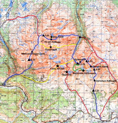 с.Курай — р.Ортолык — пер. Ортолык-Кубадру (1А, 3040) — верховья р.Правая Кубадру — пер. Памяти Бима (1А, 2970) — оз.«2500» — пер. Полезный (1Б, 2970) — оз.«2480» — рад. вер. Верховья Ортолыка (1Б, 3446) — р.Левая Кубадру — пер. 70 лет Победы (1Б, 3075) — рад. вер.«3355» (1Б) — р.Кысхыштубек — пер. Майский-Беленький (1А, 2860) — руч.Беленький — р.Корумдуайры — р.Чибитка — с.Акташ