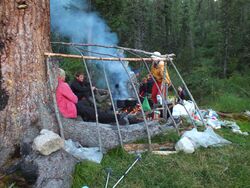 Чуть ниже увидели стоянки с деревянной конструкцией. Разбили в этом месте лагерь и
