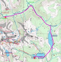 турбаза "Тушканчик" — оз. Светлое — оз. Малахитовое — пер. Пикантный №33 (1Б) — озёра Цветные (Девичьи глаза) — восх. на пик "Зуб Дракона" (2А альп.) радиально — оз. Горных духов — оз. Художников — р. Тайгиш — "Стрелка" — р. Ледяной — оз. Ледяное — пер. Близнец Запад. №36 (1Б) — оз. Большое Безрыбное — оз. Большое Буйбинское — "Стрелка" — вдп. Тайгишонок — оз. Чёрное — оз. Двойное ("Восьмёрка") — пер. Межозёрный №6 (1Б) — оз. Северное — вдп. Богатырь, вдп. Грация — пер. Спасателей 2 №4 (1А) — оз. Сказка — "Каменный Замок" радиально — пер. Сказка №9 (1А) — оз. Лазурное — пер. Волосы Саяна №14 (1А) — оз. Радужное — оз. Каровое — "Висячий Камень" радиально — пер. Тушканчик №27 (н/к) — вдп. Мраморный — оз. Мраморное — пер. Курсантов Западный №23 (1А) — оз. Художников — оз. Горных Духов — пер. Птица №31(1А) — оз. Светлое — восх. на пик "Птица" (2А альп.) радиально — оз. Светлое — турбаза "Тушканчик"