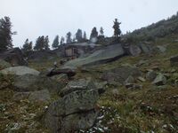 В 14:15 вышли на седловину перевала (Д.ф. 62). Нашли тур, но он был разбит, похоже медведем – наверное, кто-то положил конфетку к записке (Д.ф. 63). На перевале никакой воды нет. Обнаружил, что при подъеме я потерял фальшфейер.