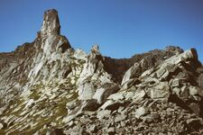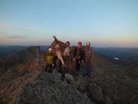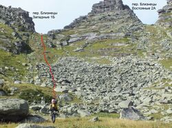 Участники, распределенные попарно по принципу «слабый-сильный», страховали друг-друга на сложных участках. Таким образом мы вышли на гребень и в 18 часов достигли вершины (Д.ф. 14). Записки в туре не обнаружили. Пробыв на вершине около часа, посмотрев на наш следующий перевал Близнецы Западные 1Б (Д.ф. 15), насладившись окружающими видами - отсюда видны почти все вершины горного массива Ергаки, - мы пошли на спуск. Основная проблема на спуске - не проскочить тропу в спусковой кулуар. Место спуска помеченно большим туром. Но идя по турикам по тропе, можно не обратить внимание на этот большой тур и проскочить. У нас так и вышло: первые участники проскочили тур и ушли дальше по тропе, пришлось их окликнуть и вернуть. В 20:00 мы спустились в лагерь.