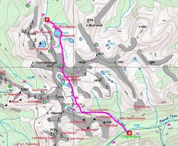 Подъем был в 7:00. Вышли в 9:00, второй группе дали рацию и договорились каждый час выходить на связь, начиная с 12.00. По тропе вдоль водопада поднялись на озеро Мраморное (Д.ф. 92). На тропе воодушевляющие таблички с информацией о том, сколько людей и в какой год упало с водопада. Обошли с востока озеро и далее по маркированной тропе (Рис. 11; Д.ф. 93) в 9:50 взошли на перевал (Д.ф. 94).