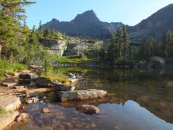Радиальный выход через перевал Вспомогательный н/к (№7) к скале "Арка" и в "Каменный замок". Вернулись в лагерь. Далее выдвинулись к озеру Сказка на перевал Сказка 1А (№9). И затем по тропе до стоянок на озере Лазурное. Ночевка на озере Лазурном.
