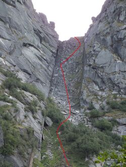 Пообедав в 15:30 мы выдвинулись на восхождение на Зуб Дракона по «спусковой» 2А. Маркированная тропа начинается с южной стороны озера . Тропа сверху обходит водопад и далее устремляется в кулуар выводящий на гребень пика Зуб Дракона. Гребень представляет из себя пологий травянисто-каменный склон до самой вершины (Д.ф. 13). Основная техническая сложность восхождения – это два скальных участка в кулуаре. Если достаточно сыро, то на этих участках может потребоваться провеска веревки, но если все сухо, то в этих местах можно обойтись гимнастической страховкой.
