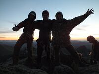 Первый участок, представляет из себя, камин, длиной где-то 40м, крутизной 45 градусов, в конце камина - карниз. Обычно этот камин и карниз проходится по полочкам справа (Д.ф. 104). Далее маршрут выходит на скальную полку (Д.ф. 105). По ней надо пройти метров 20 до «катушек». Катушки, метров 10, преодолеваются по щели справа. И затем через «очко» надо выйти на полку северо-восточной стены. С полки вверх по камину, который выводит на вершину, 10 метров (Д.ф. 106). Объяснил участникам, что и как, и они достаточно быстро провешали перила на пик Птица (Д.ф. 104; Д.ф. 106). Пролез по перилам, проконтролировал, чтобы все было сделано правильно, после этого участники стали вылазить по перилам на пик Птица. Это заняло очень много времени, начало уже темнеть, когда последний участник вылез на вершину (Д.ф. 107). Тем самым я убедился, в правильности подхода - избегать в этом походе провешивание перил - это бы привело к очень большим затратам по времени при прохождении препятствий и не сколько бы не повысило безопасность: большой группой нельзя длительное время находиться в камнеопастных местах. Затем я попросил Александра проконтролировать спуск участников на промежуточной станции, а сам, уже с фонариком, организовывал сброс веревок. Когда мы все спустились на площадку, выяснилось, что не все участники взяли фонари — пришлось все имеющиеся равномерно распределить в цепи участников, и медленно спускаться по курумнику к озеру. Участник с фонариком проходил несколько метров вперед по, затем поворачивался и освещал участнику без фонарика путь. Так потихоньку мы спустились к лесу и затем так же, не спеша, где-то к 12 ночи пришли в лагерь. Надеюсь, что такой ночной спуск выработает у участников рефлекс: всегда с собой брать фонарики.