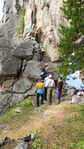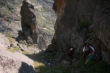На следующее утро мы устроили себе "праздник желудка" (Д.ф. 101). В 12 часов вышли скальные занятия на пик Птица, на площадку рядом с седловиной перевала Ложная Птица (Д.ф. 102). Это место постоянно используется на альпсборах для скальных занятий. В начале скальных занятий я провел ликбез по поводу скального снаряжения. Показал, как использовать стопера, френды, гексы, якоря и другое скальное снаряжение. Показал использование крюконог, лесенок и фиф на скальной стене и рассказал, как в походе подручными средствами заменить это снаряжение при преодолении крутых скальных участков. Далее, взяв две пары участников, дал им скальные маршруты, чтобы они пролезли их, используя технику ИТО, со сменой лидера в середине маршрута (Д.ф. 103). После того, как эти две пары прошли маршруты, снарядил третью пару, для восхождения по маршруту 2А на пик Птица. Маршрут 2А на пик Птица проходит слева, по западному плечу пика Птица.