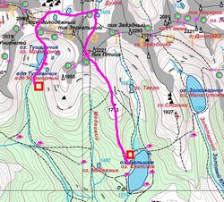 Проезд Абакан-Ергаки, турбаза «Тушканчик». По тропе вдоль реки Тушканчик до оз. Светлое, далее до оз. Золотарное (Малахитовое). Заброска No1 через перевал Зелёный 1А (No385). Ночевка на Золотарном озере.