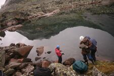 В 15:00 мы вышли на оз. Светлое и встали на обед. Здесь я посоветовал участникам переобуться в сапоги, потому что около озера Золотарного местность заболоченная. Пообедав, мы где-то через час вышли к Золотарному. И в 18:00 пришли на озеро (Д.ф. 4). На южной стороне озера, где вытекает ручей Золотарный, мы нашли хорошие площадки для лагеря, но, оказалось, это место очень ветреное. Сходив на разведку, мы нашли другие площадки, на юго-восточной стороне, но похуже - посреди морены. Однако, там не было ветра, поэтому лагерь решили разбить на той стороне. Предварительно отобрав продукты, шесть человек пошли на перевал Зеленый, чтобы сделать заброску.