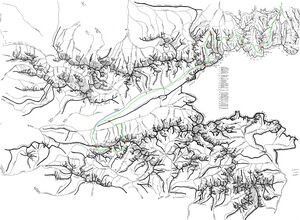 Нитка маршрута - участок вблизи перевала Занавес 2А Зелёным - заявленная нитка, синим выход(временный) с маршрута и возвращение по леднику Колоскова. Красным - путь выздоравливающего с сопровождающим.