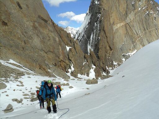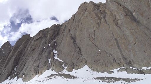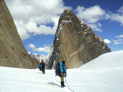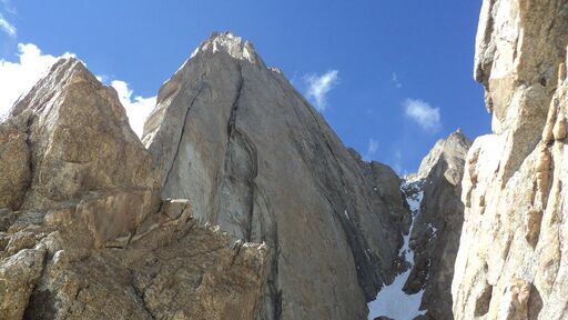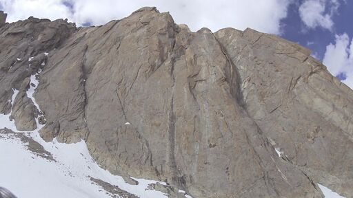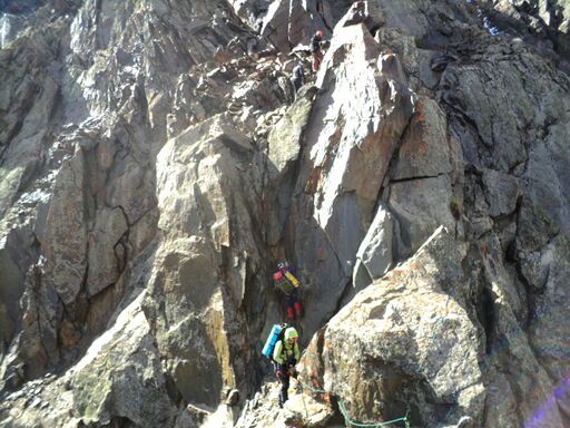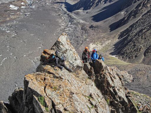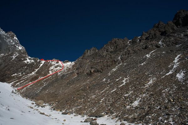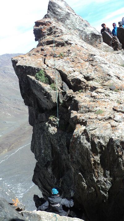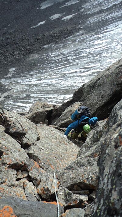 21.08: разведка предстоящего пути, предпровес нижней части. Всего мы навесили 4 наших основных веревки-полтинника, реп 60м (в нижней части, придержаться) и 15м расходняка (всего 275м перил). 2 веревки - подъем с ледниковой морены на контрфорс, остальные - вверх по контрфорсу. Скалы простые, но сильно разрушенные: нужно соблюдать осторожность и избегать камнеопасных кулуаров. Проблем со страховкой нет, перила крепятся, как правило, за выступ. Встречаются короткие участки, проходимые без страховки. В нижней части контрфорса много следов горных козлов, которые попадают сюда, очевидно, по тем самым кулуарам, куда мы из-за камнеопасности не рекомендуем соваться. Каких-либо следов горных туристов мы не обнаружили.
