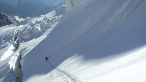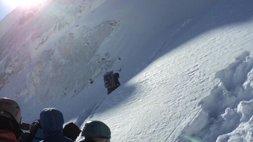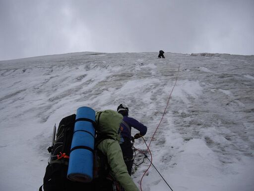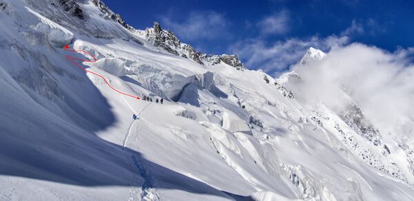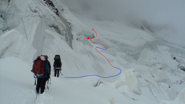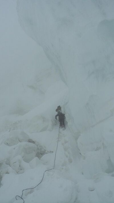 Вышли с ночевки в 7:50. Поднялись на снежную балду по навешенной с вечера веревке. Дальше пара-тройка сотен метров траверса по пологим снежным полям. Вторая перильная веревка по льду к разлому, отделяющему нас от последней, верхней полки под седловиной. Но между нашим разломом и полкой оказался ледовый провал, проблематичный для прохождения. Мы сделали короткую разведку и нашли обходной путь справа. Частично мы распутали разломы по мостам, а в верхней части навесили третью перильную веревку под ледовым козырьком с сосульками.