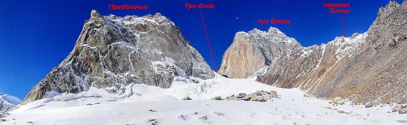 Сразу за перемычкой всю перспективу загораживает ледовый пупырь. Если спускаться с перевала в долину Тро, правого притока Зеравшана, то надо пройти налево, между южной стеной Предблочья и этим пупырем, и дальше вниз по леднику. Мы же после небольшой разведки отправились в противоположную сторону: направо и чуть вверх вдоль длинной южной стены пика Блока. Там мы вышли на ледник и поднялись по нему в самый верх цирка, где и заночевали. Координаты ночевки (GPS:N20): N39o35.09496', O70o06.52240, высота под 4700.