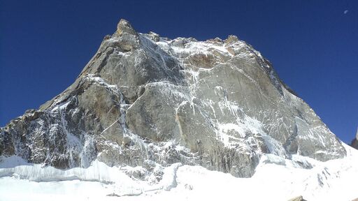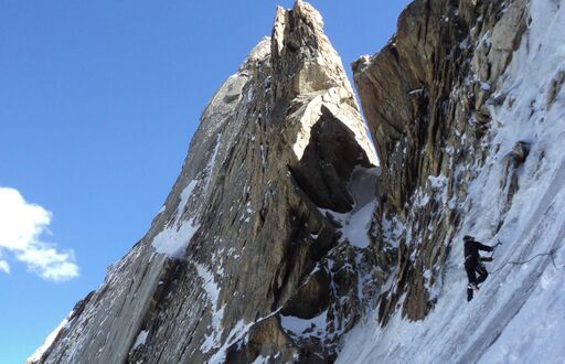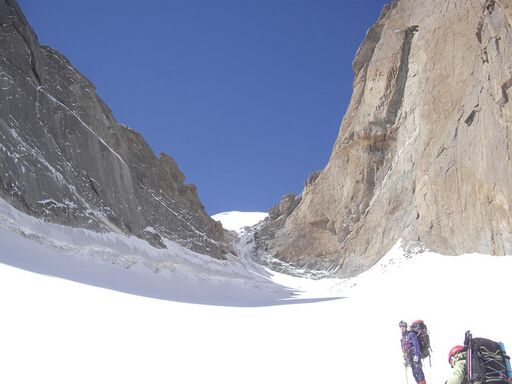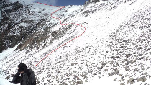 Имеющихся веревок нам как раз хватило до жандарма, сразу за которым начинался первый замысловатый участок. Продолжение контрфорса, как и переход с него в верхней части на лед, представлялись вполне проходимыми, так что разведчики остались довольны результатами. Поскольку на контрфорсе не было воды ни в каком агрегатном состоянии, идти сюда всей группой во второй половине дня было нецелесообразно. Мы оставили это удовольствие, как нам тогда наивно казалось, на следующий день.