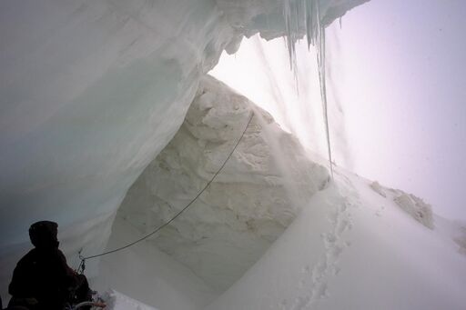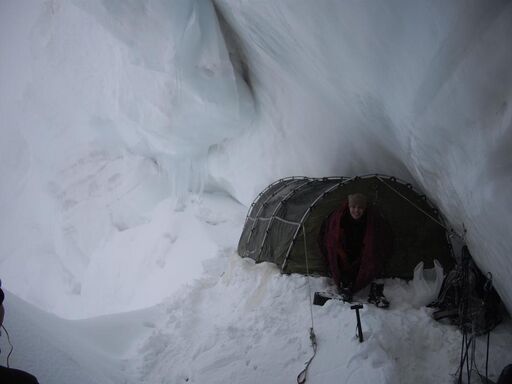 28.08: пургуем. Туча на месте, снег сыпет, с козырька непрерывно текут лавинки. К счастью, все сыплется мимо палатки, ледовый козырек над головой просто огромный. И - мертвый штиль. При абсолютном безветрии тучу ничто не сдует, сыпать будет, пока не высыплется все до последней снежинки. Казалось бы, все не так плохо: с потолка не каплет, работать, откапывать палатку не надо, жратва и бензин пока в наличии. Но бывалые участники не разделяют благодушного настроения. Хоть мы здесь и в полной безопасности, но мы сидим. И чем дольше мы сидим, тем меньше наши шансы благополучно отползти потом, когда запердон прекратится...