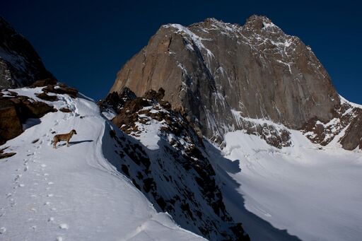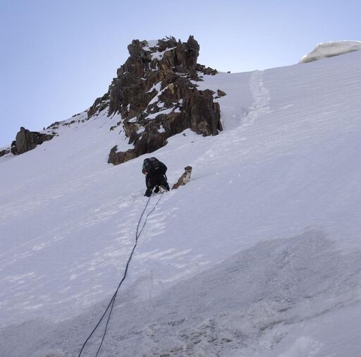 Первый перевал из трех решаем пройти немедленно, тот же Тро-Блок, только теперь на спуск. Наш же вчерашний тур не трогали. Веревку кинули прямо вниз, до бергшрунда хватило, дальше пешком. В 19:00 спустились на ровное место, заночевали (GPS:N21) (N39o35.25036', O70o07.52659', высота глючная). Оказалось, несостоявшаяся мать 9 щенков никуда не ушла, а терпеливо дожидалась нас здесь, в снегах.