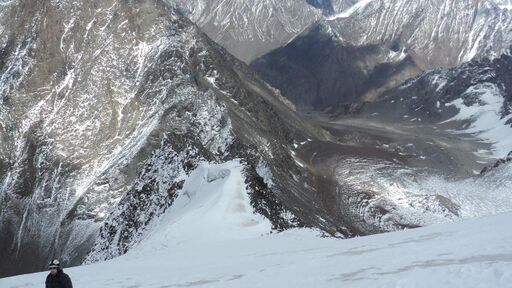 Пройдя место прошлой ночевки, в связках сбежали вниз по отрогу Звездного до перемычки между цирками Карасу и Аксу. Спуск оттуда в Карасу крутой и очень камнеопасный. В Аксу - довольно крутой, но проходимый без страховки осыпной склон. Обойдя скальные сбросы в нижней части взлета слева по ходу, мы спустились до ледниковых морен.