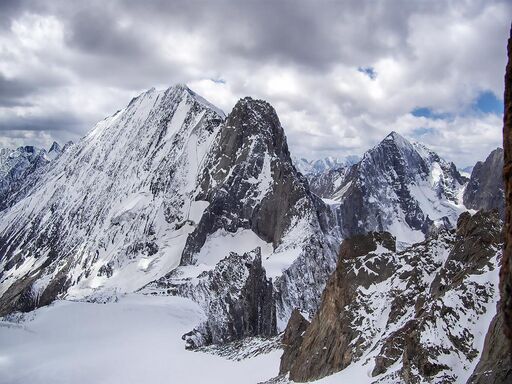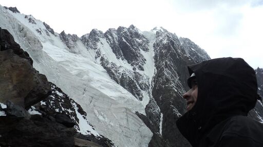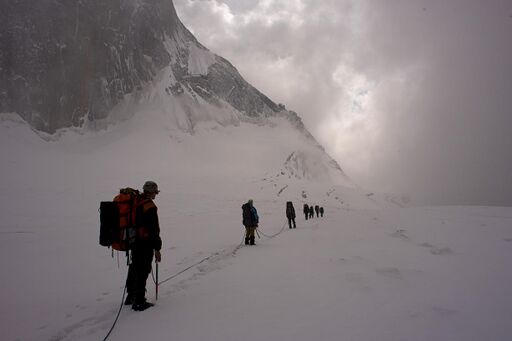 После отвесной стенки рельеф контрфорса постепенно упрощался. От жандарма с провалом включительно мы навесили еще 6 веревок. Следующий совсем простой участок около 150м прошли без страховки. Выше лазание опять несколько усложнилось. Хотя во многих местах можно было идти, но часто встречались ступени пару метров высотой, с рюкзаком без страховки не проходимые. Там мы навесили еще 6 веревок. Чем выше, тем более разрушенными становились скалы. Появился снег, мы надели кошки. На последней веревке перед выходом на лед пошло сплошное живье. Представьте себе, что в мокрый песок навтыкали вертикально тонких щепок одна к одной, и все это поставили под углом 45 градусов. Все это гуано очень ненадежно, ползет под ногами, и не за что застраховаться. Ну, как-то, придерживаясь зубами за воздух, доскреблись до льда и с удовлетворением в него забурились.