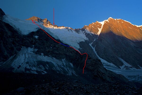 Путь по контрфорсу: красная линия - участки с перильной страховкой, синяя - без страховки; треугольник - место ночевки в бергшрунде