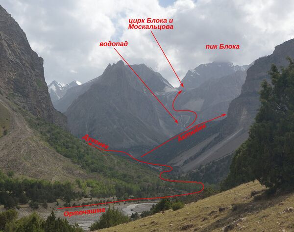 Сюда же, на Орточашму, можно прийти и из Озгерюша двумя путями, оба по скотогонным тропам. Один вариант - через перевалы Бульджума - Акташ - Джагачи, это один из стандартных заходов на Каравшин, Орточашма находится примерно на полпути чуть ближе к Каравшину. Другой вариант - из долины Аксу (Ляйлякской) через перевал Актюбек, этот перевал на полкилометра выше, зато достаточно пересечь один перевал вместо трех. Актюбек приводит к слиянию истоков Орточашмы - Актюбека и Дукенека. Если надо на Дукенек, то оттуда можно сразу уходить наверх, там есть мосты через оба притока. Кстати, сама речка Актюбек течет не из того цирка, где находится одноименный перевал, а с ледника из-под северо-восточной стены пика Блока, перевалов Блока и Москальцова. Путь в этот цирк преграждает труднопроходимый водопад, так что местные чабаны туда не ходят.