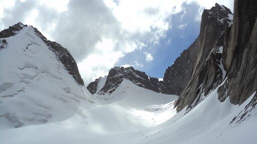 За следующие 3 ходки мы подошли под перевал. Идти удобнее всего по левому рандклюфту; упершись в склон перевала Блока (2А) повернуть вдоль него налево по ходу. И только в самый последний момент, когда по рандклюфту идти становится вовсе неудобно, приходится забраться на ледник. Место выхода на ледник с морен (GPS:Glet): N39o35.41763', O70o08.18936', H4153. Гранитные стены здесь совсем близко.